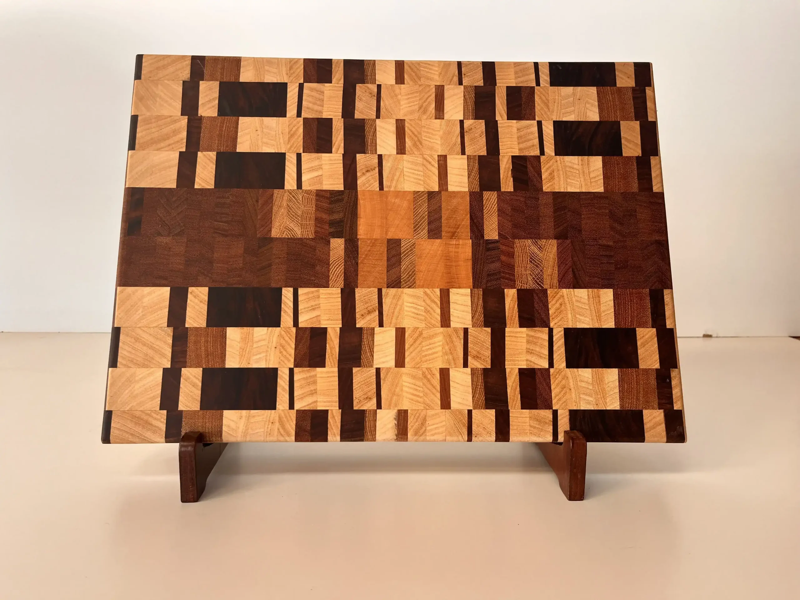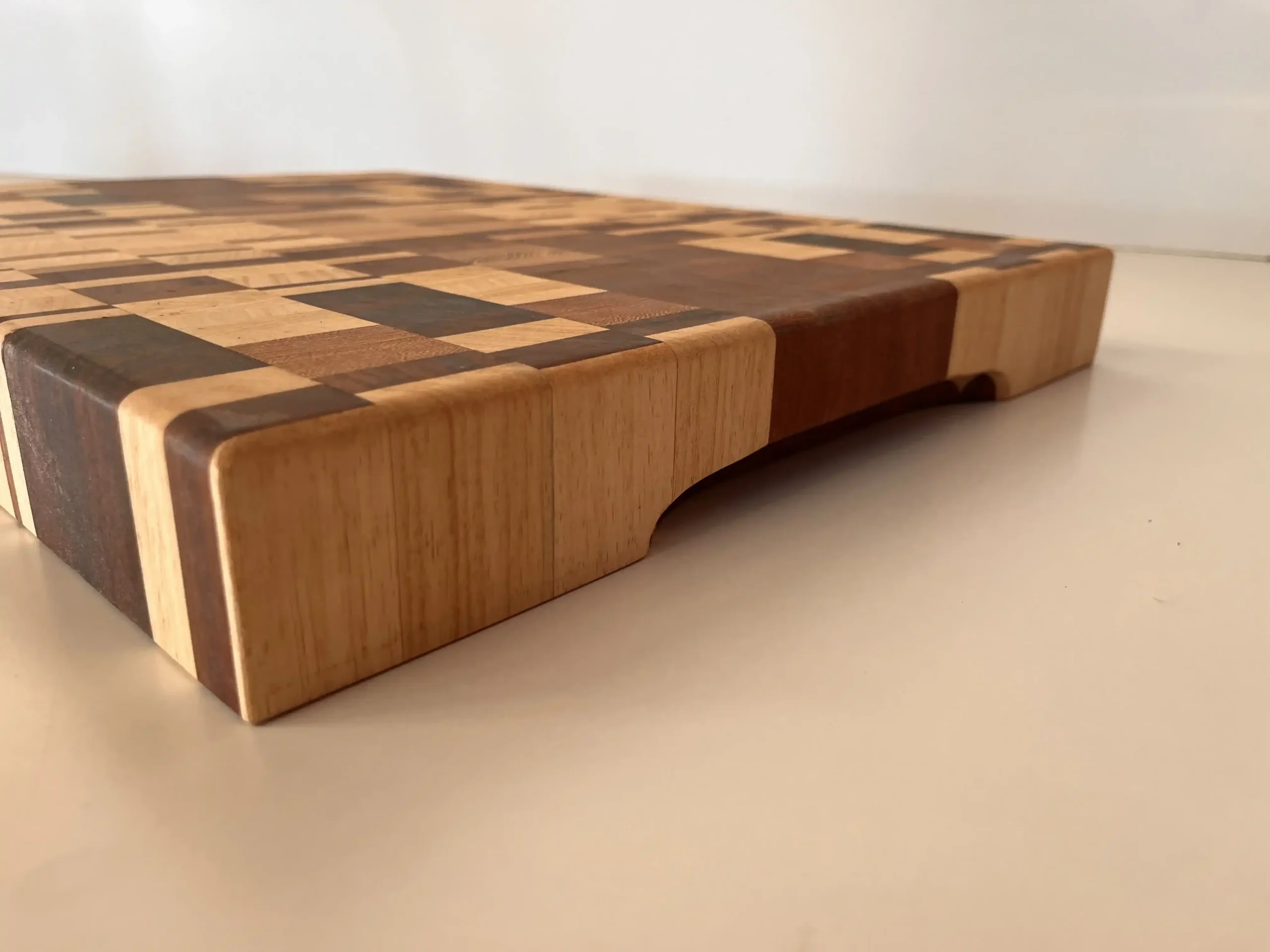 Tabla de cortar tipo End Grain elaborada a mano en madera de alta calidad. Su acabado artesanal resalta las vetas naturales, ofreciendo una pieza resistente, higiénica y perfecta para cocina profesional o uso diario. Ideal para cortar, picar y presentar alimentos con estilo.